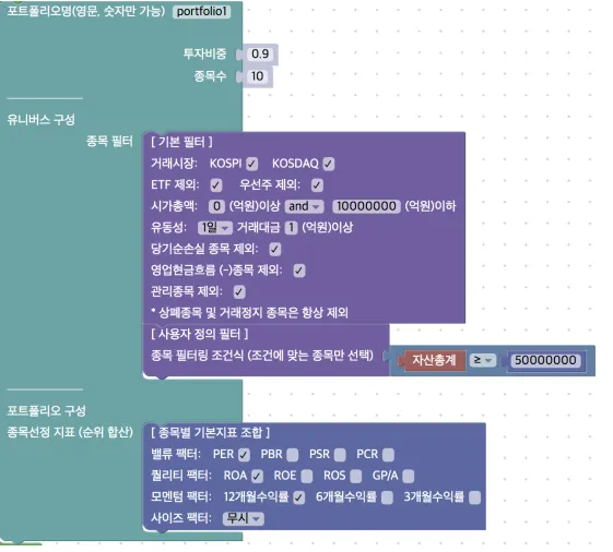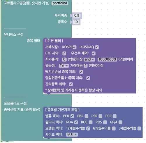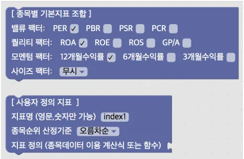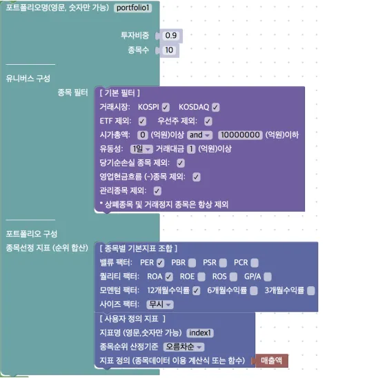 종목별 기본지표 조합: 블록에서 정의된 벨류 팩터, 퀄리티 팩터, 모멘텀 팩터, 사이즈 팩터별 지표들을 통해 포트폴리오를 구성합니다.