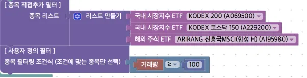 위의 예시는 KODEX200, KODEX 코스닥 150, ARIRANG 신흥국 MSCI 종목 중 거래량이 1억이 넘는 종목으로 유니버스를 구성하게 됩니다.