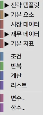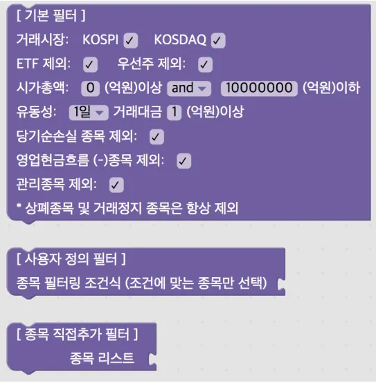 사용자 정의 필터: 기본 필터 외에 자신의 전략에 맞는 필터를 직접 구성할 수 있습니다. (조건 카테고리의 블록 또는 함수 블록 이용)