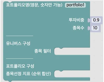 종목 필터, 종목선정 지표 블록들을 활용하여 포트폴리오를 구성할 수 있습니다. 또한 복수의 포트폴리오 블록을 사용하여 서로 다른 성격의 포트폴리오를 혼합한 전략을 구성할 수도 있습니다.