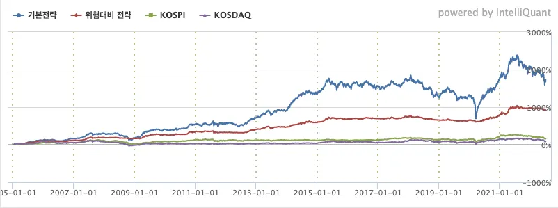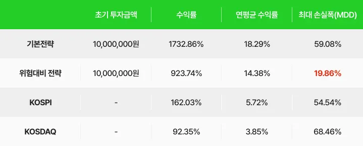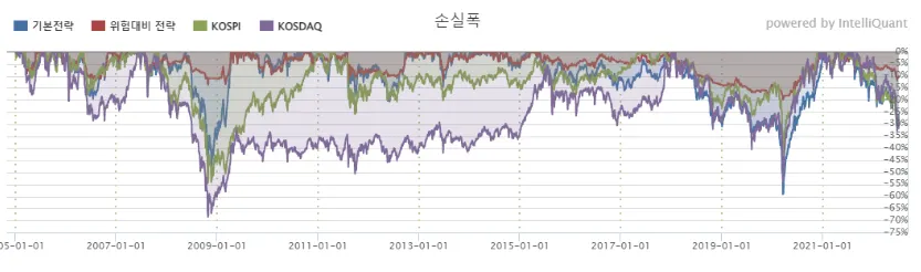 반면 위험대비 전략의 경우, 최종수익률과 연평균 수익률 모두 기본전략 대비 저조하지만, MDD가 기본전략 대비 3분의 1 정도로 줄어든 것을 확인할 수 있습니다.