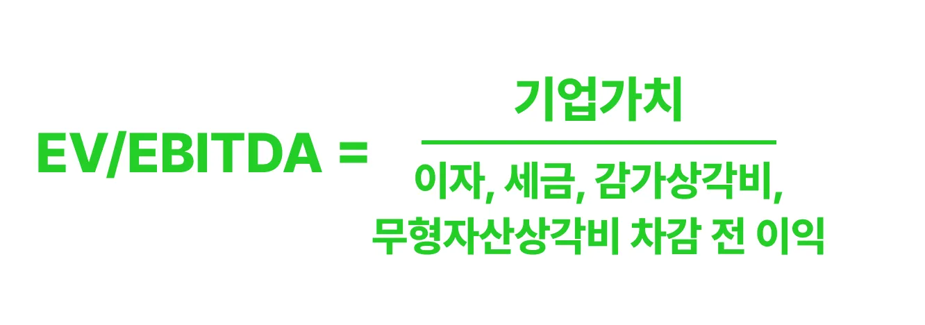 EV/EBITDA는 EV(Enterprise Value, 기업 가치)를 EBITDA(Earnings before interest, tax, depreciation and amortization, 영업이익+감가상각비+무형자산상각비)로 나눈 값을 뜻합니다. 이 때 기업가치(EV)는 기업의 시가총액+부채총액-현금성 자산을 계산한 값을 기준으로 합니다. EV/EBITDA는 현재 기업이 지닌 가치가 영업활동으로 벌어들인 이익의 몇 배인지를 나타내는 지표로 활용되며, 투자자의 입장에서는 언제쯤 내 원금을 회수하고 이익을 낼 수 있을지 판단할 때 주로 사용됩니다. 주가를 주당 순이익으로 나눈 PER 지표와 비슷하지만, 당기순손실이 발생하면 계산이 불가능한 PER과 달리 손실이 발생해도 계산이 가능하다는 장점이 있습니다. 다만 기업가치(EV)를 산정할 때 이자비율, 세금, 외부 투자, 외상 매출 등이 무시되기 때문에 과도한 투자나 부채로 재무건정성이 악화된 기업을 가려내기 어렵다는 단점을 가지고 있습니다.