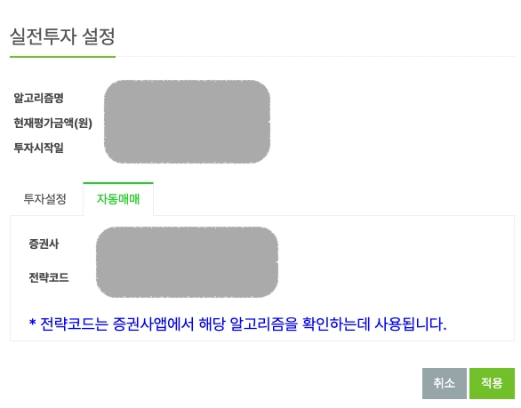 인텔리퀀트 IQ Live 페이지의 해당 전략 설정화면에서 증권사 설정이