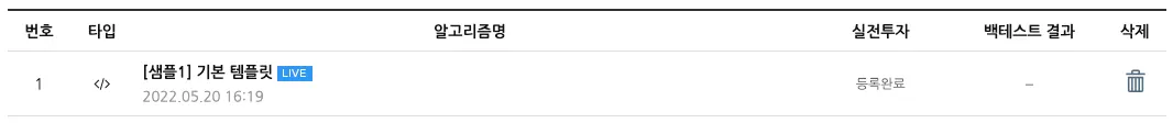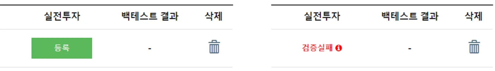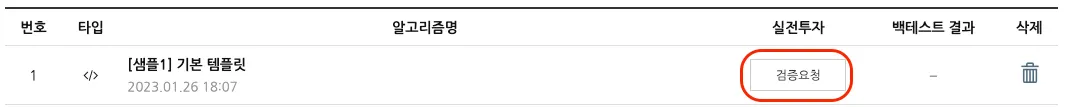 검증요청 버튼을 누르면 '검증 중'이라는 표시가 나오며, 이 때 서버 측에서 해당 알고리즘이 실전투자에서 문제 없이 실행될 수 있는지 검증하기 위한 간단한 테스트를 수행합니다.