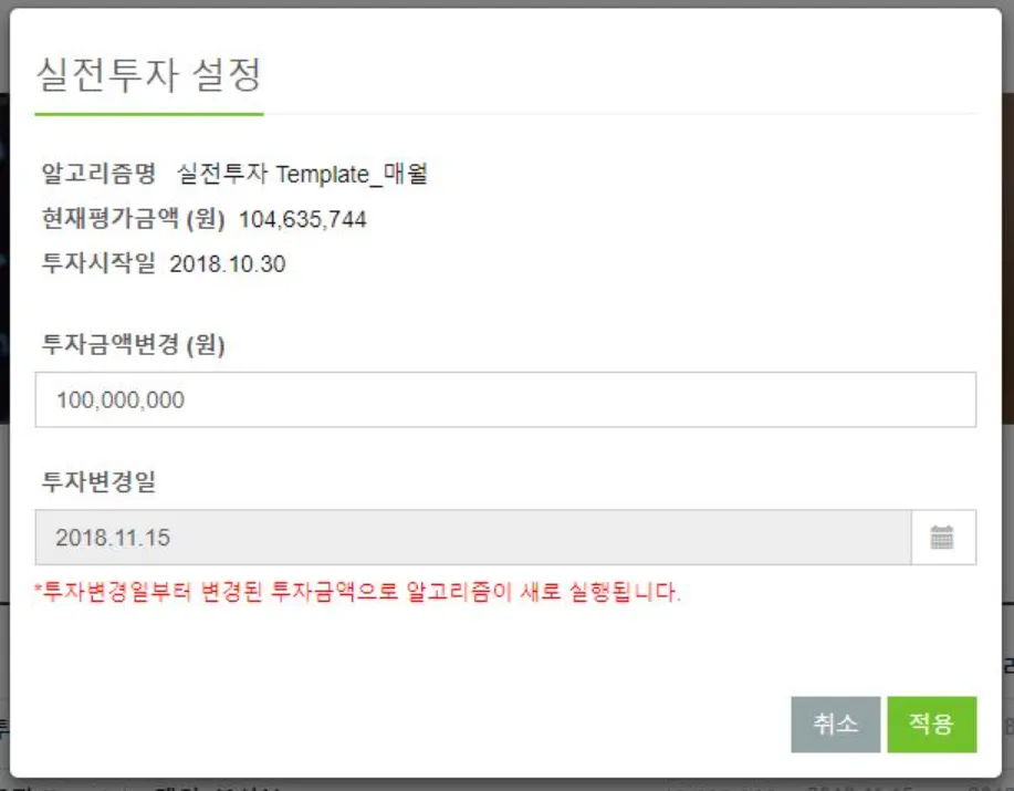 투자변경일: 알고리즘을 업데이트하거나 투자금액을 변경하는 시점에 따라 당일 또는 익일부터 변경되어 실행하도록 투자변경일이 강제 설정됩니다. 결과적으로, 변경된 투자금액이 새로운 투자원금으로, 투자변경일은 새로운 실행 시작일로 하여 스크립트가 실행됩니다.